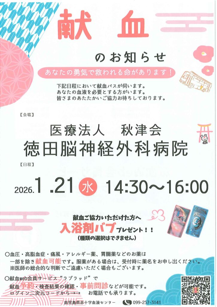 下記の日程において、当院において献血が行われます。みなさまのご協力をお願いいたします。